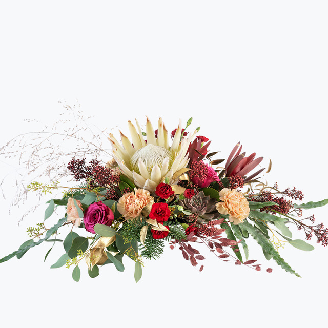 Ekslusiv dekorasjon fylt med en deilig miks av årstidens vakre skatter som garantert sprer glede til den heldige mottakeren. Gi julens confetti når du vil begeistre med et blomstrende fyrverkeri ! PREMIUM